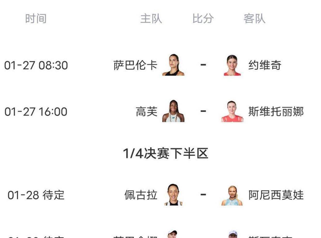 另一场今天进行的四分之一决赛,将在3号种子高芙和12号种子斯维托丽娜之间展开。 高芙在第四轮经历了三盘考验,以6比1、3比6、6比3击败了捷克好手穆霍娃。 斯维托丽娜则是一位以坚韧和防守反击著称的选手,这场比赛注定不会轻松。