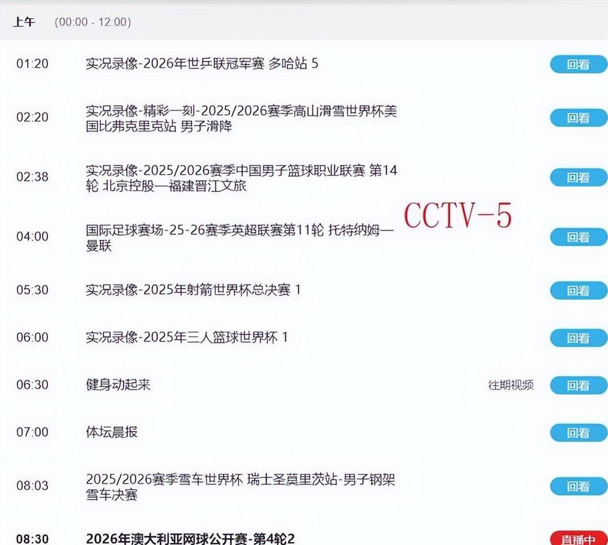 好了,先把英超这碗五味杂陈的茶放一边。对于中国体育迷来说,今天,2026年1月26日,真正的主旋律在墨尔本公园的烈日和山西主场的喧闹里。你的遥控器,主要得锁定两个频道:CCTV5和CCTV5 。