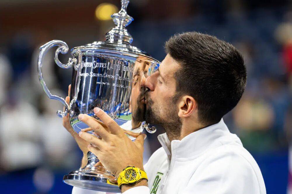 2023年9月10日,焦科维奇在2023年美国网球公开赛男单决赛颁奖仪式上亲吻冠军奖杯。新华社记者 刘杰 摄