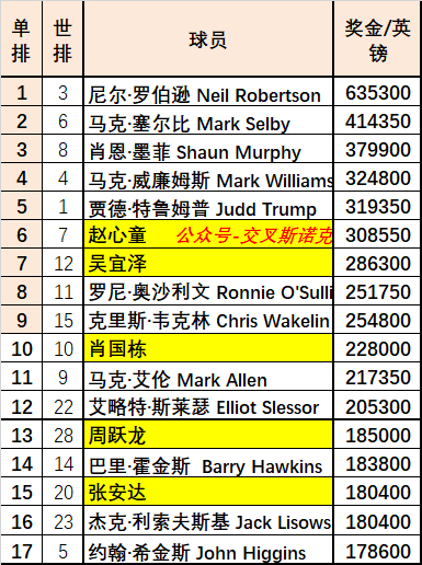 (注:奖金栏,已包含球员锦标赛首轮15000英镑奖金,未包含世界公开赛资格赛晋级奖金。)