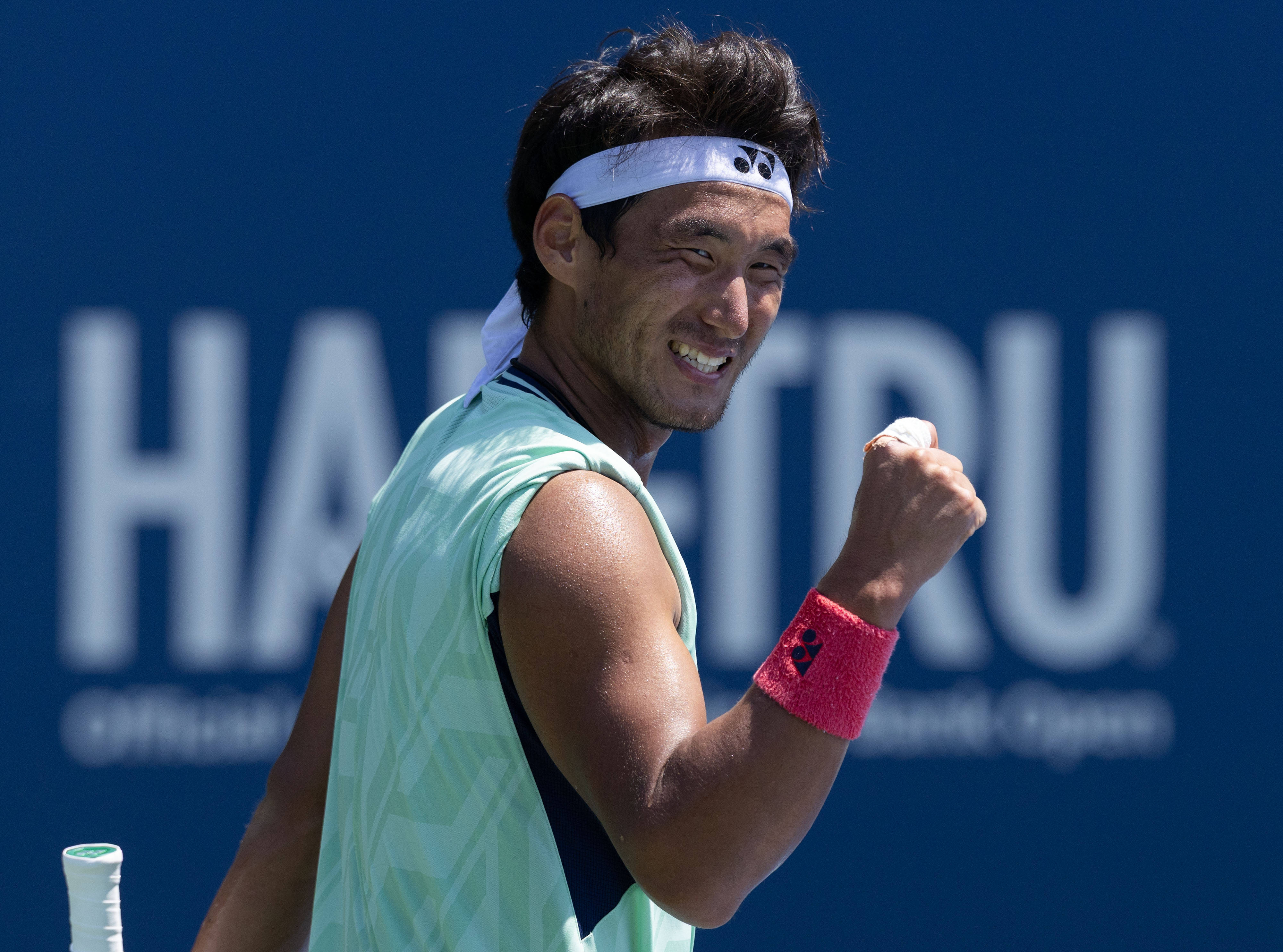 7月28日,中国选手布云朝克特在比赛后庆祝胜利。当日,在多伦多举行的2025年加拿大国家银行网球公开赛男单首轮比赛中,中国选手布云朝克特2比0战胜捷克选手科普里瓦,晋级第二轮。新华社发(邹峥摄)