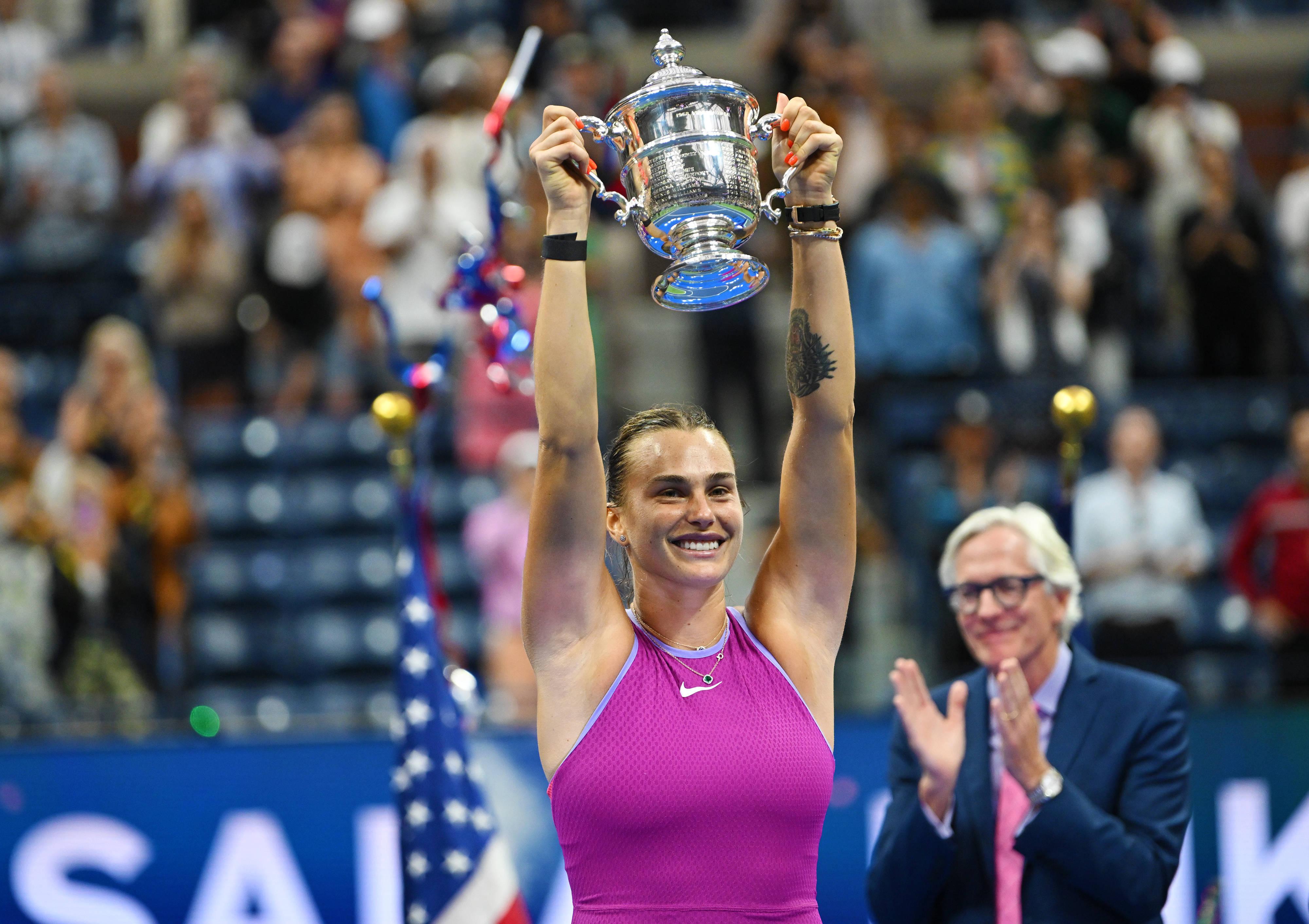2024年9月7日,萨巴伦卡在颁奖仪式上高举奖杯。当日,在2024美国网球公开赛女子单打决赛中,白俄罗斯选手萨巴伦卡2比0战胜美国选手佩古拉,获得冠军。新华社记者 李睿 摄