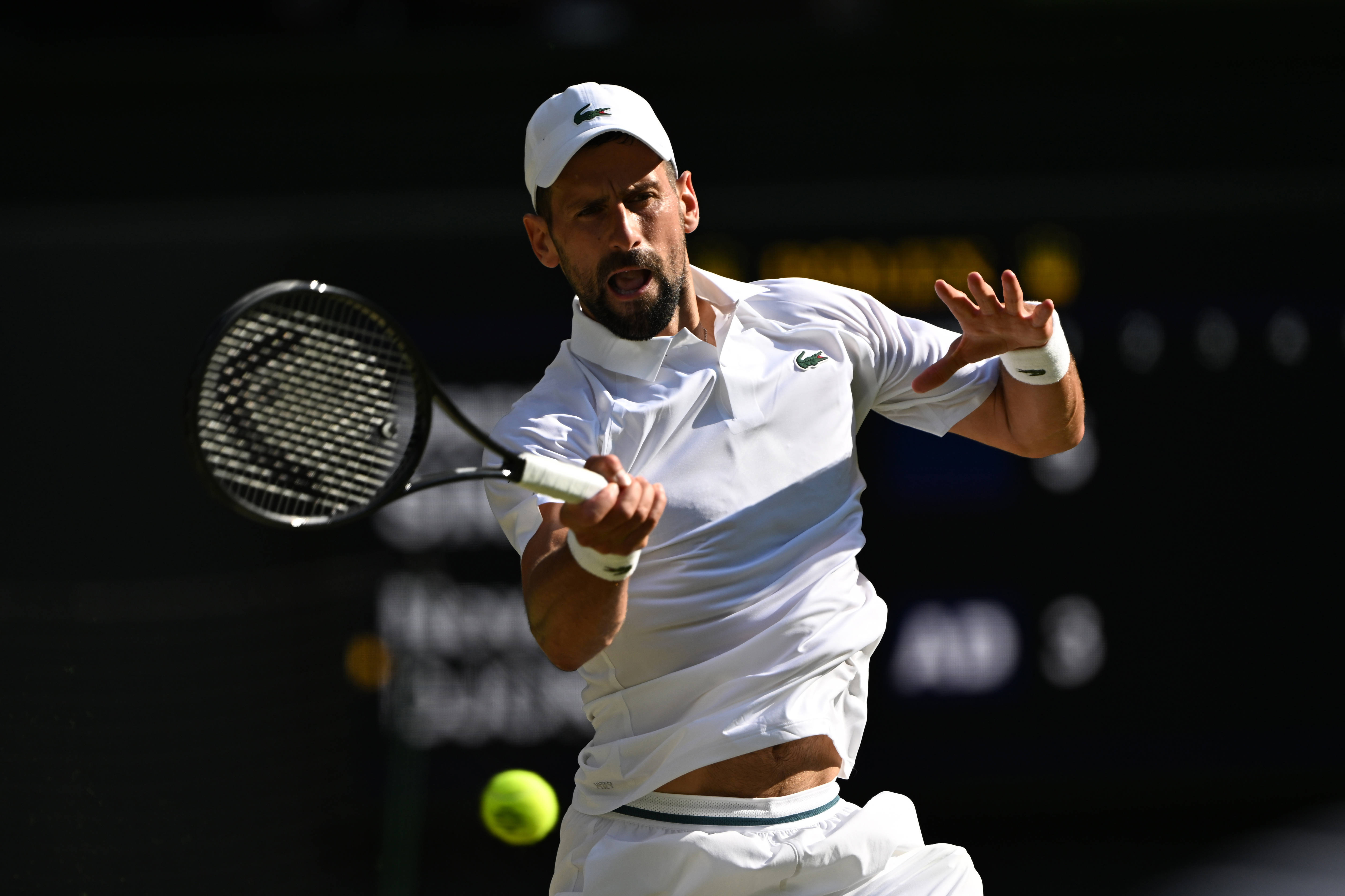 7月11日,焦科维奇在比赛中回球。当日,在英国伦敦举行的2025温布尔登网球公开赛男子单打半决赛中,意大利选手辛纳3比0战胜塞尔维亚选手焦科维奇,晋级决赛。新华社记者 赵丁喆 摄