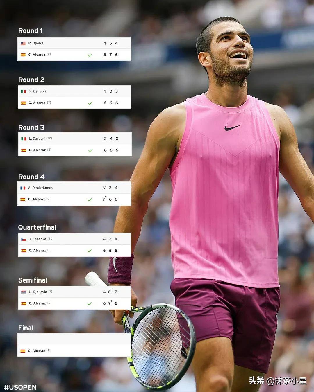 美网,美国网球公开赛,US Open,美网2025,美网直播,美网签表,美网投注,网球四大满贯/【2025美网】美国网球公开赛US Open最新赛程签表、比分直播、球员动态、冠军预测全掌握!关注美网四大满贯盛事,获取最新赔率与投注资讯。北京时间9月6日凌晨,2025年美国网球公开赛迎来首场男单半决赛的焦点之战。在阿瑟·阿什球场近两万观众的见证下,西班牙天才少年卡洛斯·阿尔卡拉斯以6-4、7-6(4)、6-2的比分完胜塞尔维亚传奇诺瓦克·德约科维奇,连续第三次闯入大满贯决赛。这场耗时2小时38分钟的比赛不仅是两代球王的权杖交接仪式,更标志着男子网坛正式进入\阿卡-辛纳\双子星时代。年仅22岁的阿尔卡拉斯将赛季战绩提升至惊人的60胜3负,最近37场赛事中仅失1场的统治级表现,让所有对手都感受到被新生代支配的恐惧。