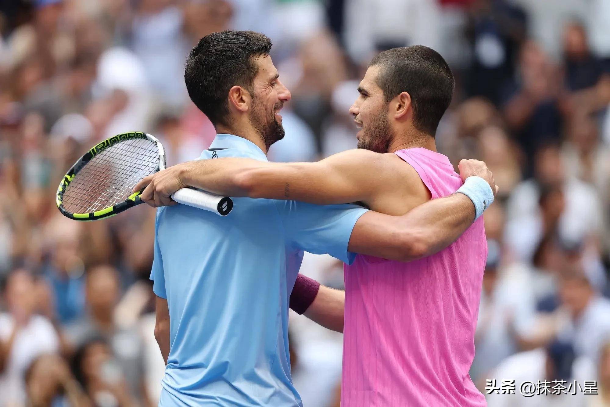 但今夜的故事不该只有胜负。当赛点时刻德约的网前截击飞出边线,摄像机捕捉到动人一幕:倚在网前的塞尔维亚人静静注视着对手庆祝,随后给迎面走来的阿尔卡拉斯送上拥抱,眼角的笑纹里盛满长辈般的欣慰。这个瞬间让人想起2016年马德里大师赛,13岁的阿尔卡拉斯坐在看台,眼中倒映着偶像征战的身影。九年后,少年在偶像最辉煌的舞成了最完美的致敬。